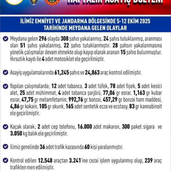 IHAAW131333-ASA/13-10-2025 – Elazığ’da 1 haftada 296 asayiş olayında, 308 şüpheli yakalandı (Fotoğraflı) Erkan Bay ELAZIĞ (İHA) – Elazığ’da son bir haftada meydana gelen 296 asayiş olayında, 308 kişi yakalanırken 24 şahıs tutuklandı. Elazığ Valiliği, 5-12 Ekim 2025 tarihleri arasındaki haftalık asayiş verilerini açıkladı. Kent genelinde meydana gelen 296 olayda 308 kişi yakalanırken, 24 kişi tutuklandı. Çalışmalarda 61 bin 245 şahıs ve 24 bin 863 araç denetlendi. Kontrol edilen araçlardan, 3 bin 241’ine cezai işlem uygulanırken 239 araç da trafikten men edildi. Yapılan çalışmalarda; 12 adet tabanca, 3 adet tüfek, 78 adet fişek, 5 adet kesici alet, 25 adet mühimmat, 4 adet tabanca şarjörü, 77,06 gram esrar, 1,163 gram kubar esrar, 47,75 gram metamfetamin, 992,76 gram bonzai, 457,29 gram bonzai ham maddesi, 4,86 gram kokain, 105 gram skunk, 165 adet sentetik ecza ve ecstasy, 83 gram kannabinoit, kaçak olarak; 2 adet cep telefonu, 16 bin adet makaron, 300 paket sigara ve 3.050 kilo balık ele geçirildiği bildirildi. Öte yandan kent genelinde 36 adet trafik kazasında 60 kişinin yaralandığı aktarıldı. (CK-Y) 13.10.2025 13:14:53 TSINNNN