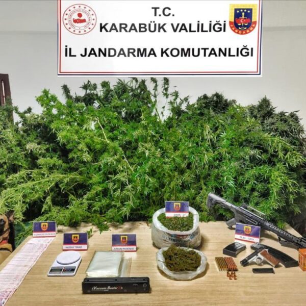 IHAAW134251-ASA/7-10-2025 – Karabük’te uyuşturucu operasyonu: 3 kişi tutuklandı (Fotoğraflı) Ersin Turan – Yasin Erdem KARABÜK (İHA) – Karabük İl Jandarma Komutanlığı ekipleri tarafından Safranbolu ilçesinde düzenlenen operasyonda, yasa dışı kenevir ekimi yaptığı tespit edilen 3 şüpheli tutuklandı. Operasyonda çok sayıda uyuşturucu madde, silah ve suçtan elde edildiği değerlendirilen para ele geçirildi. Edinilen bilgiye göre, jandarma ekipleri tarafından 3 şüphelinin bulunduğu bir çiftlikte ve çiftliğin bitişiğindeki ormanlık alanda yapılan, narkotik köpeği Eklem’in de katıldığı aramada, 56 kök skunk bitkisi, 4,63 gram kubar esrar, 2 gram kenevir tohumu, 1 vakum makinası, 119 vakum ambalaj poşeti, 1 hassas terazi, 13 eldiven, 1 ruhsatsız tabanca ve buna ait şarjör, 107 adet tabanca fişeği, 1 ruhsatsız av tüfeği, 3 av tüfeği şarjörü, 39 av tüfeği kartuşu ve suçtan elde edildiği değerlendirilen 27 bin 670 TL nakit para ele geçirildi. Ayrıca 3 cep telefonuna da incelenmek üzere el konuldu. Gözaltına alınan 3 şüpheli, işlemlerinin ardından adli makamlara sevk edilerek çıkarıldıkları mahkemece tutuklandı. (ET-YE-SO-Y) 7.10.2025 13:59:16 TSINNNN