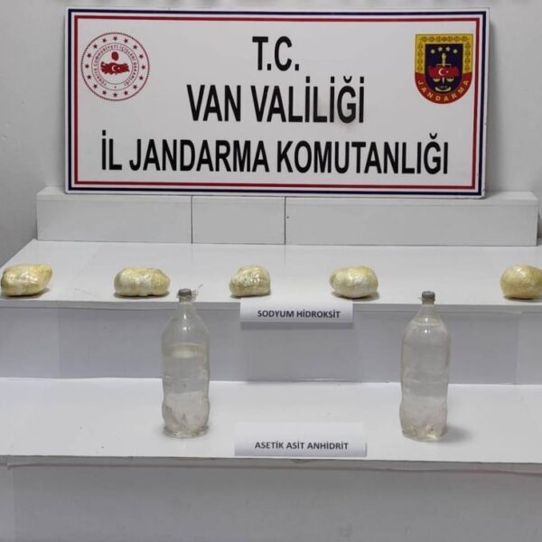 IHAAW144642-ASA/11-10-2025 – Van’da uyuşturucu operasyonu (Fotoğraflı) VAN (İHA) – Van’ın Başkale ilçesinde jandarma ekipleri tarafından yapılan çalışmalarda 4 kilo 580 gram asetik asit anhidrit olduğu değerlendirilen madde ile 3 kilo 88 gram sodyum hidroksit maddesi ele geçirildi. Van İl Jandarma Komutanlığı ekipleri, uyuşturucu tacirlerine yönelik çalışmalarını aralıksız sürdürüyor. Çalışmalar çerçevesinde Narkotik Suçlarla Mücadele Şube Müdürlüğü, Kaçakçılık ve Organize Suçlarla Mücadele Şube Müdürlüğü, İstihbarat Şube Müdürlüğü, Başkale İlçe Jandarma Komutanlığı ve Başkale Komando Tabur Komutanlığı tarafından Esenyamaç Mahallesi mevkisinde icra edilen operasyonda 4 kilo 580 gram asetik asit anhidrit olduğu değerlendirilen madde ile 3 kilo 88 gram sodyum hidroksit maddesi ele geçirilerek muhafaza altına alındı. Şüpheli hakkında adli işlem yapıldı. (EKİP-ŞAK-CC-Y) 11.10.2025 14:56:41 TSINNNN