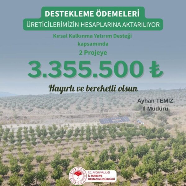 IHAAW153603-EKO/11-10-2025 – Aydın’da kırsal kalkınmaya 3 milyon TL destek (Fotoğraflı) Uğur Eser AYDIN (İHA) – Aydın İl Tarım ve Orman Müdürlüğü, Kırsal Kalkınma Yatırımları Destekleme Programı kapsamında 2 projeye toplam 3 milyon 355 bin 500 TL destek ödemesi yaparak üreticilerin hesaplarına aktardı. Aydın İl Tarım ve Orman Müdürlüğü, üreticilere yönelik destek ödemelerine devam ediyor. Kırsal Kalkınma Yatırımları Destekleme Programı kapsamında, il genelinde hayata geçirilen 2 projeye toplam 3 milyon 355 bin 500 TL tutarında hibe ödemesi üreticilerin hesaplarına aktarılıyor. İl Tarım ve Orman Müdürü Ayhan Temiz, yapılan desteklerin üreticilerin güçlenmesine ve kırsal ekonominin sürdürülebilirliğine katkı sunduğunu belirterek, “Kırsalda üretim var, bereket var, Türkiye’nin geleceği var” ifadelerini kullandı. (UE-Y) 11.10.2025 09:07:18 TSINNNN