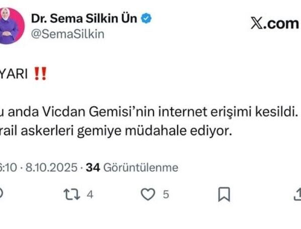 IHAAW084816-GEN/8-10-2025 – İsrail askerleri Milletvekili Ün’ün de bulunduğu Vicdan gemisine müdahale etti – İsrail askerleri, internet erişiminin kesilmesinin ardından gemiye müdahale etti (Fotoğraflı) Mehmet Barlas DENİZLİ (İHA) – İsrail’in Gazze’ye uyguladığı ablukayı kırmak ve insani yardımları ulaştırmak için ‘Vicdan’ gemisiyle İtalya’dan yola çıkan Denizli Milletvekili Sema Silkin Ün, bu sabah saatlerinde internet erişiminin kesilmesinin ardından İsrail askerlerinin gemiye müdahale ettiğini duyurdu. İsrail’in Gazze’ye uyguladığı ablukayı kırmak ve insani yardımları ulaştırmak için yola çıkan Küresel Sumud Filosu’na Tunus’tan katılamayan Denizli Milletvekili Sema Silkin Ün, daha sonra İtalya’daki Otranto Limanı’ndan Akdeniz’e açılan “Vicdan” gemisi ile bu sabah saatlerinde Gazze açıklarındaki uluslararası karasularına ulaştı. Dün akşam bir video paylaşan Ün, bu sabah saat 06.00 sıralarında ise internet erişiminin kesilmesinin ardından İsrail askerlerinin gemiye müdahale ettiğini duyurdu. Saatler önce yaptığı son paylaşımda kendilerini bekleyen tehlikelere değinen Milletvekili Ün, “Bu vicdan yüklü gemiden çekmiş olduğum son akşam videosu olacak. Yarın sabah saatlerinde uluslararası sular olmasına rağmen İsrail’in adını sarı, turuncu, kırmızı hat olarak belirlediği, ‘tehlikeli hat’ dediği bölgede olmuş olacağız. Bizim bütün duamız ve bütün umudumuz o hatları geçip Gazze’ye ulaşmak, Gazzeli kardeşlerimizle kucaklaşmak. Yolculuk sırasında yaşadığımız tüm zorlukları dualarla aştık. Bu kutlu seferin tüm bereketi sizin dualarınız sayesinde oldu. Bu son akşam da sizlerden tekrar dua istiyorum. Biz bütün günümüzü duayla geçirdik, bu gece sabaha kadar da dua edeceğiz. Belki bu sayede o yollardan geçeceğiz ve Gazze’ye ulaşacağız. Bizleri umutla bekleyen evlatlarımıza, kardeşlerimize ve ablalarımıza sarılmak nasip olacak. Rabbim bizlere Gazzeli kardeşlerimizle kucaklaşmayı nasip etsin. Bu saatten sonra önce Allah’a, sonra sizlere emanetiz” ifadelerini kullandı. (MB-BÇ-CC-Y) 8.10.2025 09:01:32 TSINNNN