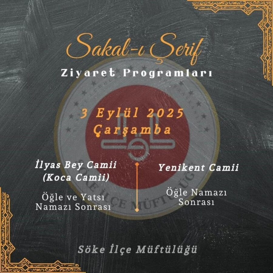 IHAAW124032-GEN/2-09-2025 – Sakal-ı Şerif Söke’de ziyarete açılacak (Fotoğraflı) Levent Tuncer AYDIN (İHA) – Söke İlçe Müftülüğü, Mevlid Kandili dolayısıyla Sakal-ı Şerif ziyareti programı düzenleyecek. Mübarek geceyi idrak edecek olan vatandaşlar, düzenlenecek programla birlikte Sakal-ı Şerif’i görme imkanı bulacak. Söke İlçe Müftülüğü’nden yapılan açıklamada, “3 Eylül 2025 Çarşamba Sakal-ı Şerif ziyaret programı; İlyas Bey Camii (Koca Camii) öğle ve yatsı namazı sonrası, Yenikent Camii öğle namazı sonrası” ifadelerine yer verildi. (MU-OD-Y) 2.09.2025 12:45:27 TSINNNN