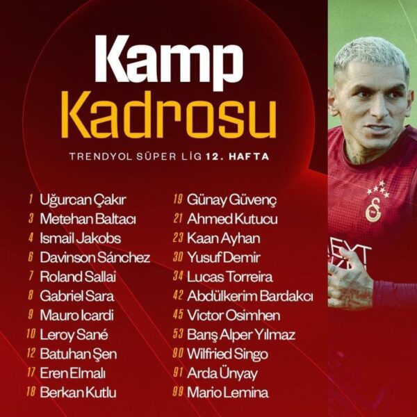 IHAAW202939-SPO/8-11-2025 – Galatasaray’ın, Kocaelispor maçı kamp kadrosu belli oldu (Fotoğraflı) İSTANBUL (İHA) – Trendyol Süper Lig’in 12. haftasında Kocaelispor’a konuk olacak Galatasaray’ın kamp kadrosu açıklandı. Trendyol Süper Lig’in 12. haftasında Galatasaray yarın saat 17.00’de deplasmanda Kocaelispor ile karşılaşacak. Bu maçın hazırlıklarını tamamlayan sarı-kırmızılılar, otobüsle müsabakanın oynanacağı Kocaeli şehrine hareket etti. Kadroda sakatlıkları bulunan Yunus Akgün ile İlkay Gündoğan yer almadı. Sarı-kırmızılıların, Kocaelispor müsabakasının kamp kadrosu şöyle: “Uğurcan Çakır, Metehan Baltacı, Ismail Jakobs, Davinson Sanchez, Roland Sallai, Gabriel Sara, Mauro Icardi, Leroy Sane, Batuhan Şen, Eren Elmalı, Berkan Kutlu, Günay Güvenç, Ahmed Kutucu, Kaan Ayhan, Yusuf Demir, Lucas Torreira, Abdülkerim Bardakcı, Victor Osimhen, Barış Alper Yılmaz, Wilfried Singo, Arda Ünyay ve Mario Lemina.” (ORT-TK-S) 8.11.2025 20:34:15 TSINNNN