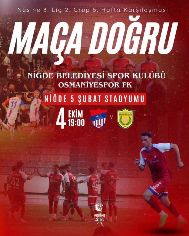 IHAAW135623-SPO/2-10-2025 – Niğde Belediyespor, Osmaniyespor maçına hazır (Fotoğraflı) Sema Tekeli NİĞDE (İHA) – TFF 3. Lig’de mücadele eden Niğde Belediyespor, 4 Ekim 2025 Cumartesi günü sahasında Osmaniyespor FK’yı konuk edecek. 5 Şubat Stadyumu’nda oynanacak karşılaşma saat 19.00’da başlayacak. Kırmızı-beyazlı ekip, taraftarının desteğiyle sahadan galibiyetle ayrılmayı hedefliyor. Kulüp yönetimi yaptığı açıklamada, “En büyük gücümüz taraftarımız. Tüm Niğdelileri tribünlere bekliyoruz. Hep birlikte takımımıza güç katacağımıza inanıyoruz” ifadelerine yer verdi. Niğde Belediyespor, bu kritik mücadelede alacağı sonuçla ligde üst sıralara tırmanmayı hedefliyor. (EK-Y) 2.10.2025 13:56:52 TSINNNN